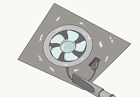 Clean the inside of the fan housing using a vacuum attachment. Use the bristle brush attachment on the vacuum to clean the inside of the vent as well, sucking up any dirt or grime near the motor and along all the edges of the fan housing. Be thorough to make sure there’s as little dust and dirt left up there as possible. Stand on a stool or small ladder to reach the inside of the fan housing, if needed. If you don't have a vacuum, use large paint brush or scrub brush to brush out the dirt in the vent, catching it with a dust tray or something similar. A damp cloth can also be used to individually wipe the fan blades.
