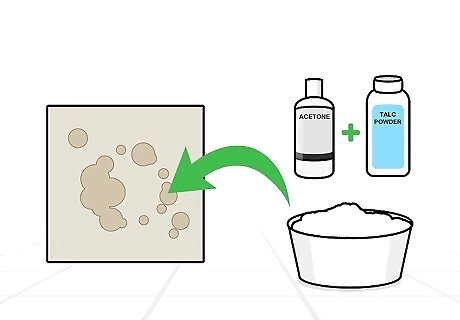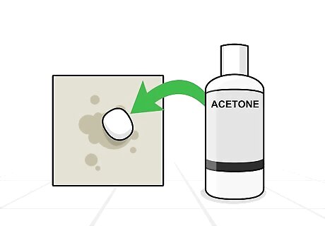 Dissolve oil stains with acetone. Cooking grease, milk spills and makeup splatters don’t stand a chance against acetone. Dip a cotton ball in a small amount of acetone and lightly dab any oil-based stains. Immediately flush the area with water from a dampened sponge.
