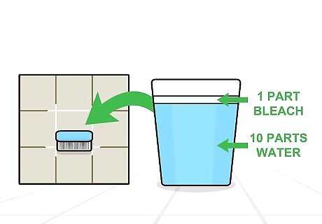 Use 1 part bleach to 10 parts water on white grout. Whiten discolored white grout by mixing a solution of 1 part bleach to 10 parts water. Scrub grout with the solution and thoroughly wipe all bleach off with a water dampened sponge. Dry the area completely by wiping with a clean cloth and directing a fan on it.