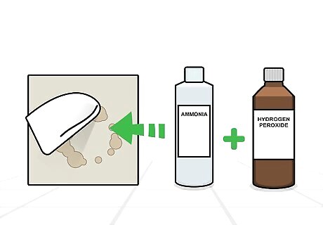 Clean water-based stains with hydrogen peroxide and ammonia. Get rid of stubborn stains from coffee, tea or pet urine with hydrogen peroxide and ammonia. Rub a small amount of 12% hydrogen peroxide and a drop of ammonia on stains with a soft cloth or sponge. Rinse the area immediately with a water dampened sponge.