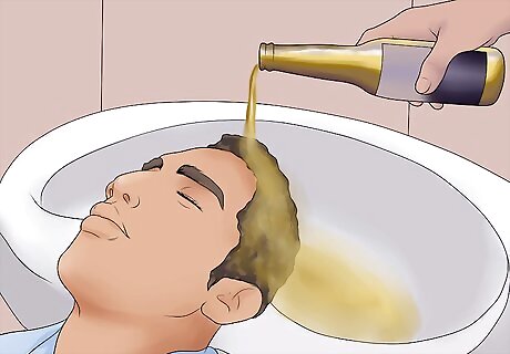 Pour the beer slowly through your hair. The beer has proteins and vitamins that help make hair healthy, and the malt and hops strengthen the cuticles, helping to repair hair damaged from blow-drying, coloring, and curling.