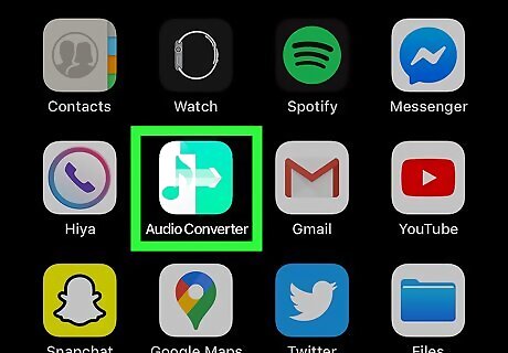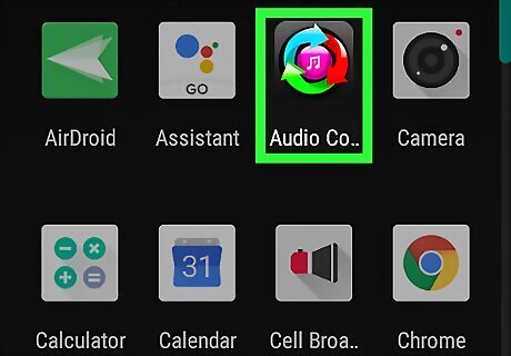Open The Audio Converter. This app icon looks like a single music note on the left of a blue and white background with an arrow pointing towards the other side of the background that you can find on your home screens or by searching.