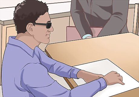 Arrange accommodations. People may be unaware of the accommodations that you need as a blind or visually impaired individual. Use positive language to state your needs. If you know of resources that you can share with others, this may help you be an even better advocate for yourself. If you are aware of certain light bulbs, places/computer programs to have documents translated to braille, or other resources that could help your employer or school accommodate you it can help make the process easier. You might start by directing them to the American Foundation for the Blind. At work, for example, you might need an adjustment in your schedule because of transportation limitations in your area. Be clear with your employer about how much time is needed based on the transit options you have. At school, for example, you may need larger print or an adjustment in lighting. Make sure that your teachers know that this is a necessity for you to perform your best. You can approach your teacher after class and say something like, "I can't see what you write on the chalkboard and it makes it hard for me to follow the lesson and take notes. Can I move to a desk in the front row or could you write in larger print on the board?" If you are not given the necessary accommodations, you have the right to file a formal complaint. Take note of when and where the incident occurred. Prepare documentation of your request for accommodations and the denial of your requests. You can file complaints with the Equal Employment Opportunity Commission (EEOC) or with your school district.
