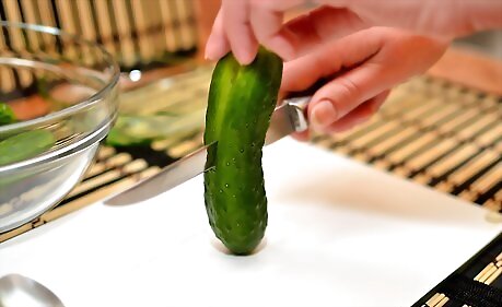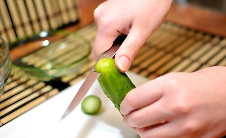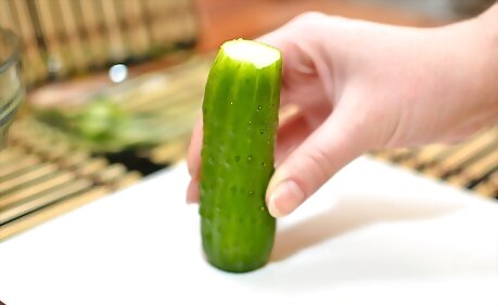 Lay the cucumber on your cutting board in a vertical position. The cucumber should be perpendicular to the edge of the countertop.