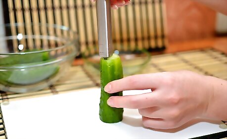 Stand the cucumber up on your cutting board with its widest flat end on the bottom. Keeping the widest part at the base will stabilize the cucumber as you core it.