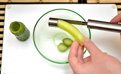 Push the corer through the cucumber until the tip of the corer reaches the cutting board.