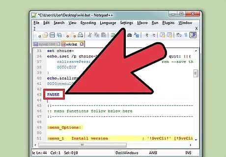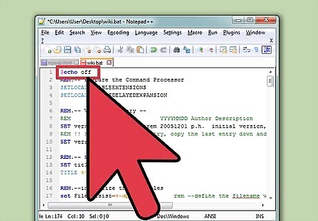 Write your code. The first line of code in your bat file should always be "@echo off", unless debugging. The use of the symbol "@" will prevent the echoing of your line of code, and following the echo command with "off" will prevent your computer from displaying the command prompt when your bat file runs. After this first line of code, you can use basic commands and syntax to write the code you wish your bat file to perform.