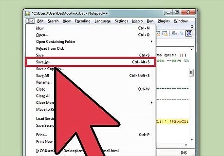 Save your code as a bat file. Now that you've finished writing your code, you can click the "File" menu, likely on the top menu bar of your text editor, and select "Save as". This will open a directory where you can navigate to a location on your computer where you wish to save your bat file. When you have selected your save destination, name your file in the field to the bottom of your save directory, and end your file name with the extension ".bat". For example, if your file name were "CreateABatchFile," you would end the name of your file like so: CreateABatchFile.bat.