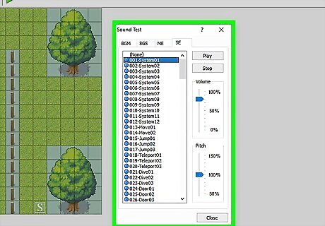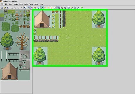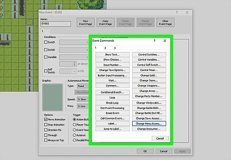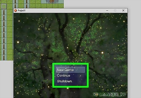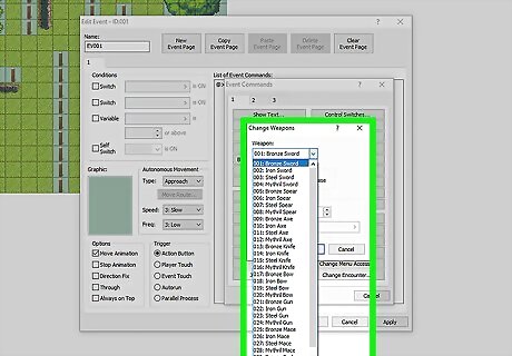 Create your events. Here is where the meat of your game creation process lies. To create an event, select the “events” layer. Double click a tile on the map. The options here are immense, but common things you might do are place an NPC (non-playable character, such as a generic village inhabitant) to speak to, cause a conversation to occur between characters, or initiate a battle. You can also cause these events to trigger in multiple ways including upon touch, on clicking the space bar (the default “select” button”) next to the tile, or automatically upon entering the map.There is an extremely large variety of customization possible while creating event tiles, and discovering them is part of the fun.