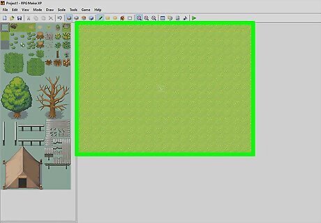 Make the map first. The reason for doing map making as your next step is that it will help you to better visualize your world. Doing this will allow you to potentially change your mind about, and fine tune every other aspect of your game. To start creating a map, right click on the first initial map in the map pane, right below the tileset, and click "New Map". You make maps using “tilesets”, which are picture files that have a large variety of different objects and environments within them that are separated by the game maker into a grid. This is because everything you create visually in your game is done as a grid. Each square represents one step a character can take. In these squares, you can place one square of your selected tileset. You can also create events, which will be discussed later. It’s also worth mentioning that you can utilize three layers with which to make your map, especially useful for making walls, ceilings, and just anything that you want to be above ground. You can also edit each square in a tileset to have different characteristics such as the ability to be walked through, and/or from which directions. This is done in the Tilesets tab in the Database, discussed later. If you are creating sub-maps that are meant to exist within other maps, for example, a small cave in a forest, make it a sub-map of the forest by right clicking the bigger map and creating the smaller map from that, rather than from the world map. It will make visualizing where maps are that much easier.