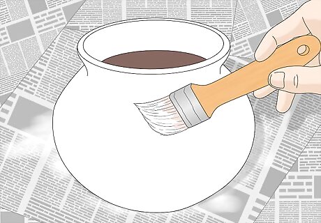 Paint the pot with either white or black enamel, coating it completely. This provides an initial sealing layer, ensuring that the design will adhere to the pot with ease. Allow this coating to dry for 4 hours, or for as long as directed by the manufacturer.