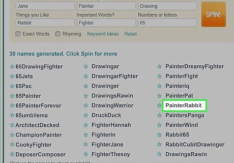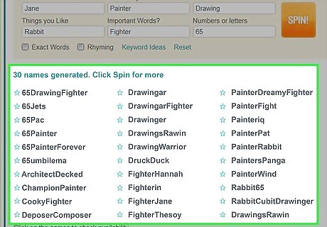 Review the list of username results. In the results section below the text fields, look for a username that you like. If you don't like any of the results, you can click SPIN! again to come up with new options.