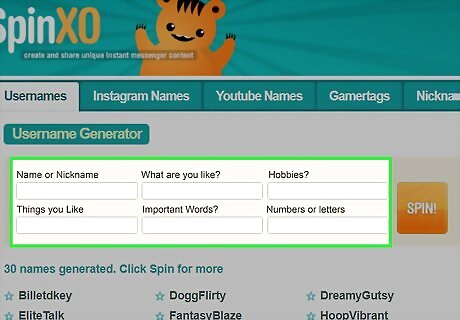 Answer questions about yourself to generate username options. At the top of the SpinXO page, fill out one or more of the following fields: Name or Nickname - Your name or a common nickname. What are you like? - Enter any word or phrase here. Hobbies? - Add a word or two for your favorite hobby. Things you Like - List one or a few different things that you like. Important Words? - Add one or two words that you enjoy. Numbers? - Add one or two numbers that you enjoy.