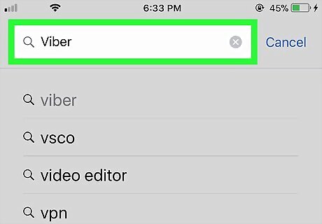 Type Viber in the search bar. Tap the grey bar at the top of the page and type viber with the keyboard, then tap the blue "Search" key. This searches for the Viber app in the App Store.
