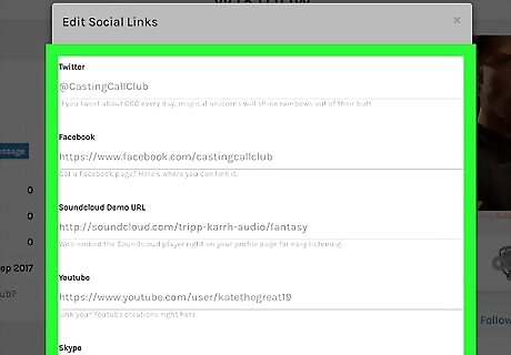 Add social links to your profile. This is so that other members know where else to find you if they want to cast you. You can add links to Twitter, Facebook, Soundcloud, YouTube, and Skype.