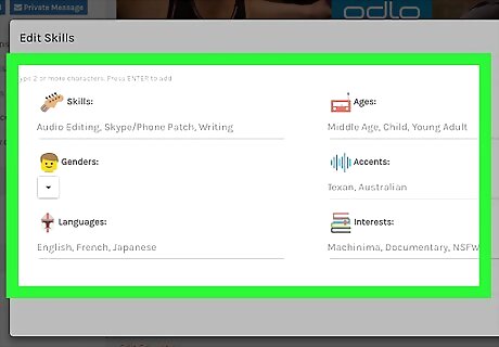 Edit your attributes. This is an important part, as your attributes let other members know what you're capable of doing. You can add abilities to your Skills, Genders, Ages, Languages, Accents, and Interests.