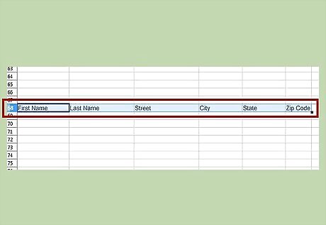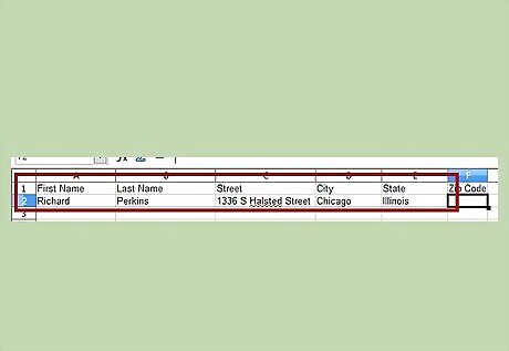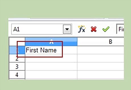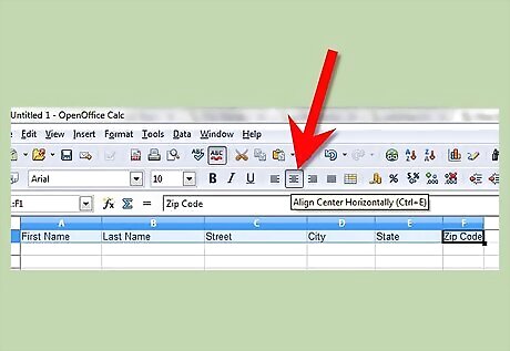 Name the columns. Change A1 to F1 to the following: First NameCreate an Address Book Using Open Office Calc Step 6Bullet1.jpg Last NameCreate an Address Book Using Open Office Calc Step 6Bullet2.jpg StreetCreate an Address Book Using Open Office Calc Step 6Bullet3.jpg CityCreate an Address Book Using Open Office Calc Step 6Bullet4.jpg StateCreate an Address Book Using Open Office Calc Step 6Bullet5.jpg Zip CodeCreate an Address Book Using Open Office Calc Step 6Bullet6.jpg