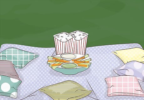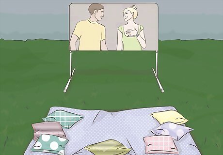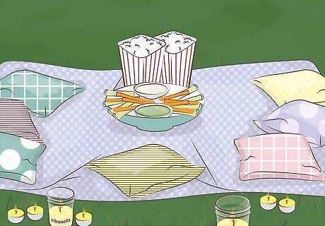 Place cushions, blankets, and comfortable chairs around your screen. Movies are long, so you’ll want to make sure that your guests have a comfortable place to sit throughout. Folding camping chairs or bean-bags work great for this. If you don’t have any chairs on hand, you can lay blankets and pillows on the ground. If it’s going to get chilly later in the evening, remind your guests to bring along sweaters.