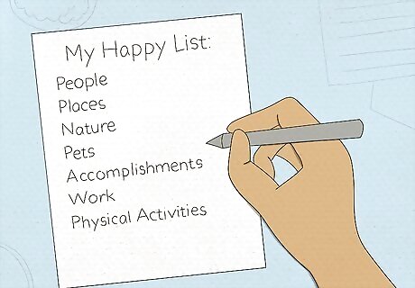 Make your happy list. Write down all the things that make you happy, including people, places, nature, pets, accomplishments, work, and physical activities. Write freely without censoring yourself. Once you are finished, take a look at your list, and ask yourself if you are embracing these parts of your life. Perhaps there is something you enjoy that you could do more often. Perhaps there is a relationship that is important to you that you have been neglecting.
