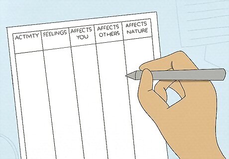 Chart your happiness footprint for a week. Draw a table with five columns. In the first column, write down an activity you enjoy. For each activity, fill the other four columns with how it makes you feel, how it affects you, how it affects other people, and how it affects the natural environment. The chart helps you to identify opportunities in your daily life where you can make a shift towards sustainability. You may discover that you could reduce waste and improve your health by eating less junk food. This is better for yourself and the environment. By walking instead of driving for short trips, you could become more physically active and reduce pollution from car travel.