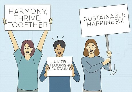 Participate in local politics to promote sustainable happiness policies. Sustainable happiness requires political activism to ensure that equitable policies are passed. Not only does political activism increase happiness, but it can help bridge the gap between your individual efforts and the sustainable happiness of the community. Stay alert to how your city council or town hall is dealing with sustainable issues. Read their website for information on upcoming meetings, decisions, and votes. You can: Visit an open town hall meeting. Organize a peaceful rally. Offer to visit schools as an educational speaker. Write a letter to your city council members.