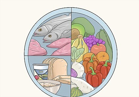 Eat a balanced diet in moderation to help you lose weight. Exercise is a great way to keep the weight off, but it will be more effective in combination with a balanced diet. Be sure to eat leafy greens, whole grains, fruits, dairy, and proteins, and avoid saturated fats and processed foods. The combination of diet and exercise will help you lose weight faster than just exercising.Tip: A balanced meal includes ½ of a plate of fruits and vegetables, 1 cup of dairy, ¼ of a plate of whole grains, and ¼ of a plate of lean protein.
