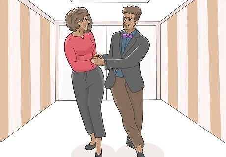 Dance with a partner in latin or ballroom dance. If you want to bring a friend with you to class, consider taking a partner dance like ballroom or latin. These classes combine quick movements with an air of performance and fun. Most beginning classes will teach you the basics of each move and allow you to work out your whole body as you dance. Having a dance partner is a good way to keep yourself motivated. Try not to wear shoes with rubber soles while you're ballroom dancing—they can make it hard to turn.