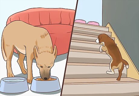 Keep food and water dishes within easy reach. If your dog is stiff in the morning, don’t force them to climb up or down stairs in order to get breakfast. Place the dishes on the same level of the house that the dog sleeps on. By the time doggie has had a bit to eat and walked around a bit, they should have worked a bit of their stiffness out.