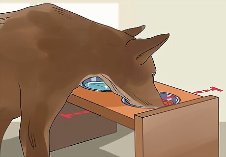 Use raised bowls. Larger dogs might develop stiffness in their necks as they get older. In order to help them during breakfast, place their food and water dishes on a low platform or step-stool. The raised dishes should be at the level of their mouth. This will save them the trouble of needing to crane their neck downwards to eat.