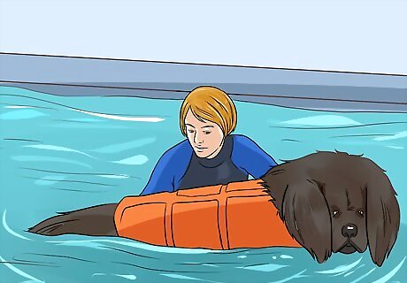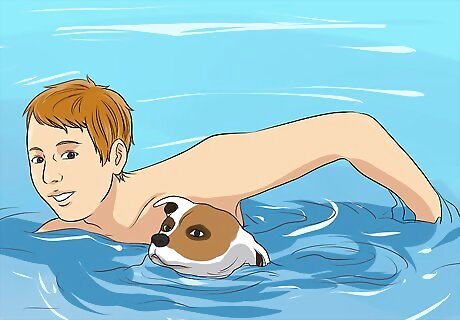 Go for a swim. When your dog is swimming, the water’s buoyancy lifts and supports your dog, allowing it to move about more freely than it would otherwise. Take your doggie to the lake or a slow-moving stream or river for a fun summer outing that can improve your dog’s mobility.