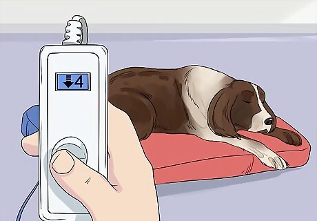 Keep your dog warm. Drops in temperature can affect the joints of older dogs more than younger dogs. Place an electric blanket or heating pad beneath your dog’s bed at night. Keep the setting as low as possible at first. Gradually increase the temperature until you see a reduction in your dog’s stiffness in the morning. If you notice your dog sleeping elsewhere, rather than its normal bed where the heating pad is under it, you probably have the electric blanket or pad turned up too high. Reduce the temperature to a comfortable level. Likewise, if your dog is getting up in the middle of the night, or going back and forth between its bed with the heat source beneath it and another, cooler area of the house, you should turn the heat down.