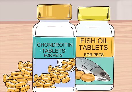 Add supplements. Supplements that improve joint health can help relieve your dog’s morning stiffness. They are available in oral, liquid, and (with a veterinarian prescription) injectable forms. Fish oil – used to improve joint support – is one of the most common doggie supplements. Other popular supplements the provide similar effects include glucosamine and chondroitin, which are often available in one combination supplement. Hyaluronic acid can also help lubricate joints for increased morning mobility. Always follow manufacturer directions when administering supplements. Only give your dog as much as is appropriate based on its age and weight.