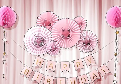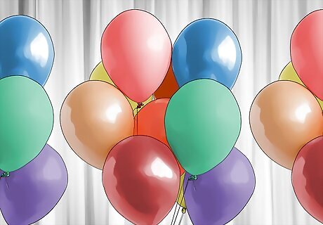 Blow up lots of balloons to create a festive atmosphere. Join clumps of 6 balloons together to create feature pieces. Hang these up on curtain rails to give a festive feeling to the house. Another option is to secure a string from one end of the room to the other and tie the balloons along the string. If you feel creative, sprinkle colourful confetti into clear balloons to create an elegant look. Purchase balloons from dollar stores, grocery stores, or party supply stores. Pick a colour scheme for your party, such as black and gold, and purchase balloons of those colour Avoid using balloons for young children’s parties as the popped balloons will be a choking hazard. If the birthday guest is turning a significant age, purchase a helium balloon with their age printed on it.