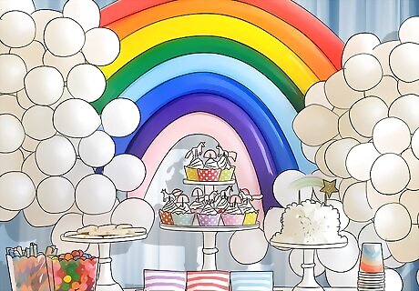 Decorate your home with rainbow colours for a young child's party. A rainbow theme is a fun and easy way to style a party. Use as many colours as possible to create a rainbow feeling. Where possible, arrange the colours in the order of the rainbow (red, orange, yellow, green, blue, indigo, violet). Use different coloured balloons and streamers to add colour to your home. Purchase disposable plates and cups that have rainbow pictures on them. Use chalk to draw rainbows on the driveway.