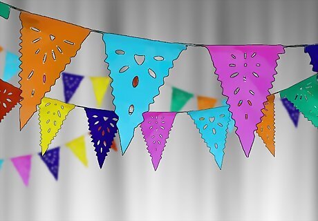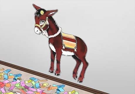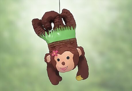 Hang a piñata up to set a party atmosphere. Piñatas are a great way to create a fun and colourful focal point to a room. Purchase a piñata that fits with your theme and fill it with treats. Tie the piñata to an exposed ceiling beam or a ceiling hook. Try to hang the piñata somewhere central in room so that children won’t hit the wall when they try and open it. Purchase a piñata from a party supplies store.