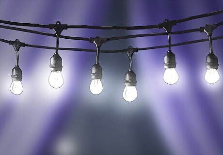 Hang up decorative lights to create a party atmosphere. Lights are a great way to set the mood for a party. Hang festoon lights or fairy lights in the trees, from the rafters, or over exposed ceiling beams. If you don’t have any decorative lights, ask a friend if you can borrow theirs or hire some from a party supplies store. If possible, use LED lights as these won’t burn party guests if they accidentally touch the bulbs.