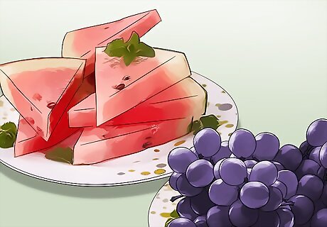 Use bright coloured food on the table as decorations. Place brightly coloured foods, such as watermelon, grapes, chopped carrots, fairy bread, or cake with bright icing on the food table to add colour to the party. Place different coloured foods next to each other to create contrast. For example, place red watermelon besides green rock-melon, and yellow cake. Children will be drawn to the bright colours. If the weather is good, consider having the food table outside. This will save your floors from getting dirty from dropped food or drink. Assemble the food in a rainbow shape if you are having a rainbow themed party.