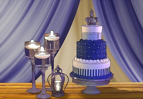 Hang up a photobooth backdrop. Guests love to take pictures at parties to remember the night by. Hang the backdrop in a well lit area where the guests will linger throughout the party. The living room and the courtyard often work well. Choose a backdrop that fits the theme of your party. For example, choose a sparkly gold backdrop if you are having a royal or monochromatic theme. Purchase a photobooth backdrop from a party supplies shop or get creative and make your own. If you decide to make your own, consider hanging streamers, tinsel, paper chains or ribbons on the wall.