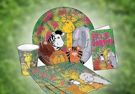 Purchase disposable tableware that fits your theme. Choose tablecloths, napkins, cups, and plates that are related to your theme. For example, if you're hosting a jungle-themed party, pick plates, cups, and napkins in various animal prints. Purchase disposable tableware from a party supplies store