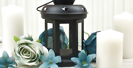 Surround the base of the lantern with flowers and/or candles. If you’re using lanterns in your centerpieces, embellish them on the outside with 2-3 small candles that match the rest of your decor. Then, put a few flowers into 2 or 3 identical small vases around the outside of your lanterns or wrap them around garland-style. This should help to tie the lanterns into the rest of the decorations effectively.