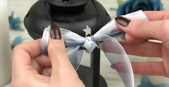 Tie a ribbon to the handle of the lantern. This is a quick, simple way to add some personal flair to your lantern. If you’re going for a vintage and/or feminine look, tie simple white lace ribbon around the handle. If your decor is centered more around a color than a style, tie a silk ribbon that’s one of your wedding colors into a bow around the handle instead.