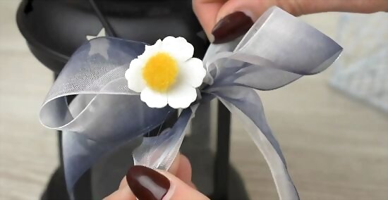 Glue a sheer bow and silk daisies to a corner of the lantern in the summer. Cut a long piece of wired sheer ribbon and tie it in a bow. Then, glue three silk gerbera daisies to the center of the bow with a hot glue gun. Attach the back of the bow to the corner of the lantern with hot glue as well.
