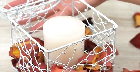 Fill the base with fresh flower petals. Hold a wedding flower of your choosing, such as a rose, by the stem and gently pick all of its petals off. When you’re done, repeat this process on several different flowers. Then, sprinkle the petals all over the interior floor of your lantern to achieve soft, simple, prettiness. These can be used as additions to centerpieces or you can hang them on small poles along the ceremonial aisle. This may be a great option if you have some flower pieces leftover after you’ve made the bouquets, boutonnieres, and all other wedding decorations that your flowers were intended for.