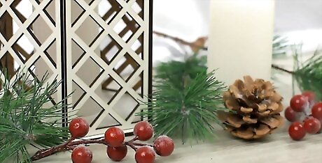 Wrap a pine garland around the base of your lantern in winter. Purchase a fake pine garland from your local craft store or holiday store. Wrap the garland around the outside of the base of your lantern. To add a holiday feel to the garland, string some cranberries onto a strand of dental floss and weave it throughout the garland. You may need to wrap the garland around more than once, depending on how long it is.