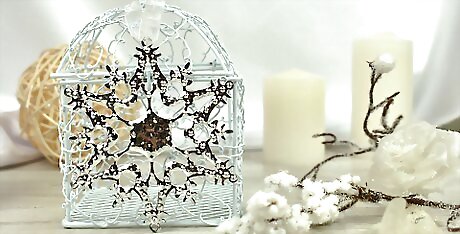 Tie an ornament to the handle of your lantern in winter. Purchase a relatively flat holiday ornament, such as a sparkly snowflake, from a local craft store or a local holiday store. Since there should already be a string attached to the top, it should be easy to tie the string to the center of the handle on your lantern to give it some wintry flair.
