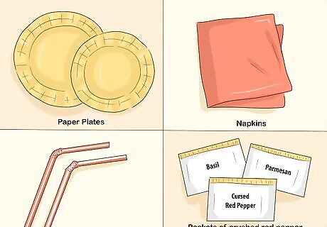 Bring “extras” along with you. Anticipate your customers’ needs. Before you leave the store, gear up with the same free items that are offered in-store, even if the customer didn’t ask for any. Then, when you deliver the food, ask if they’d like them. These could include: Paper plates Napkins Straws Packets of crushed red pepper, parmesan, basil, etc.