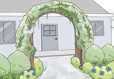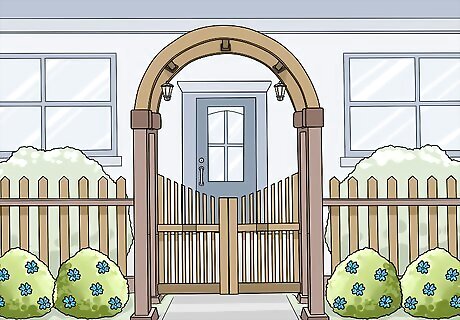 Place garden gates on the same plane as your front door. A garden gate is a doorframe or overhang that separates your front yard from your backyard. If your front yard is enclosed, put a garden gate in front of your front door to create a beautiful symmetry for your front yard. If the front yard is open, place a garden gate on the same horizontal plane as your front door on one of the sides of your building. A garden gate leading into your front door is a great way to make your front yard feel like a distinct, separate space. A garden gate on the side of your home will function as a clear divider for guests and bystanders. This will create a heightened sense of privacy. You do not need to include a garden gate if you don’t want to.