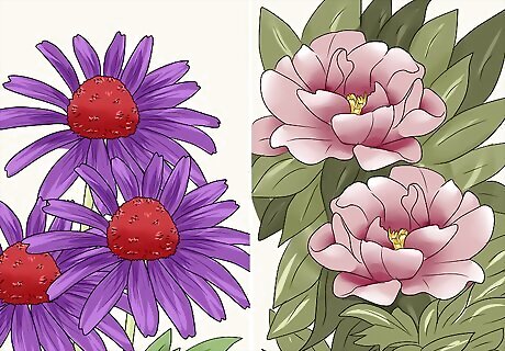 Select resilient flowers based on your climate. Perennial flowers that will bloom for longer periods of time are the best choice if you want to avoid wilting flowers and dead plant matter in your yard. Aster is a great choice if you want a flower that blooms late into the fall and comes in a variety of colors. Peonies are excellent flowers that can live for decades in the right climate. Choose resilient species on their colors and shapes. Make sure that you only plant flowers that succeed in your climate. Look each potential flower up online or ask the clerk at your local flower nursery to figure out what will grow well in your area. Delphinium is a great choice if you’re looking for vertical flowers that grow taller than normal flowers.