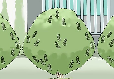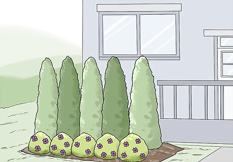 Plant evergreen or deciduous bushes and shrubs near your foundation. For your shrubs and bushes, select deciduous or evergreen plants that don’t easily wilt or die in harsh weather. Boxwood, inkberry, and holly are all excellent choices for the area near your foundation since they require little work when it comes to maintenance. Foundation plants should be placed at least 4–6 feet (1.2–1.8 m) away from the building to ensure that the roots don’t grow into your foundation. This will also make it easier to access the exterior walls of your home. For more colorful options, Girard’s Rose bushes, azalea, and chokeberry are fun choices. Japanese barberry is a great choice if you want a shorter bush that grows in wild directions. Korean boxwood is a great choice if you prefer small-leaved shrubs that can be cut into unique geometric shapes. Most evergreen and deciduous bushes grow in a variety of climates. Evergreen varieties are particularly good for colder climates. Remember, though, that there's really no such thing as low-maintenance when it comes to gardening. Shrubs might end up growing and you need to be ready to deal with them.