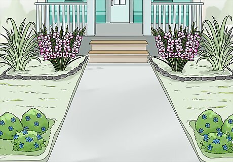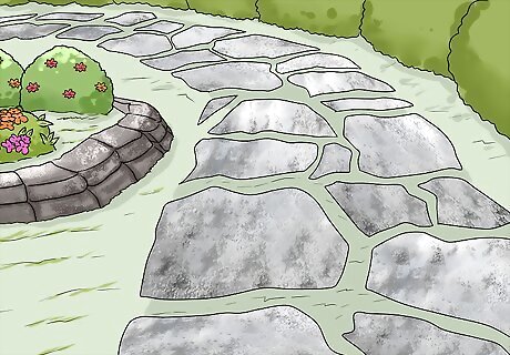 Make your walkways obvious to avoid confusion. If you’re installing a brand new walkway, avoid winding paths and don’t place large plants along your walkway to keep things clear. Use guide lights to line your walkway with small bulbs to make it easier to see where you’re going at night. Consider lining both sides of your walkway with gravel to create a barrier between guests and the plants in your yard. You can use separate slabs of limestone instead of concrete for your walkway if you want to create a unique, modern vibe in your yard. You can use fine gravel instead of concrete or stone if you don’t live in a particularly busy or windy area.